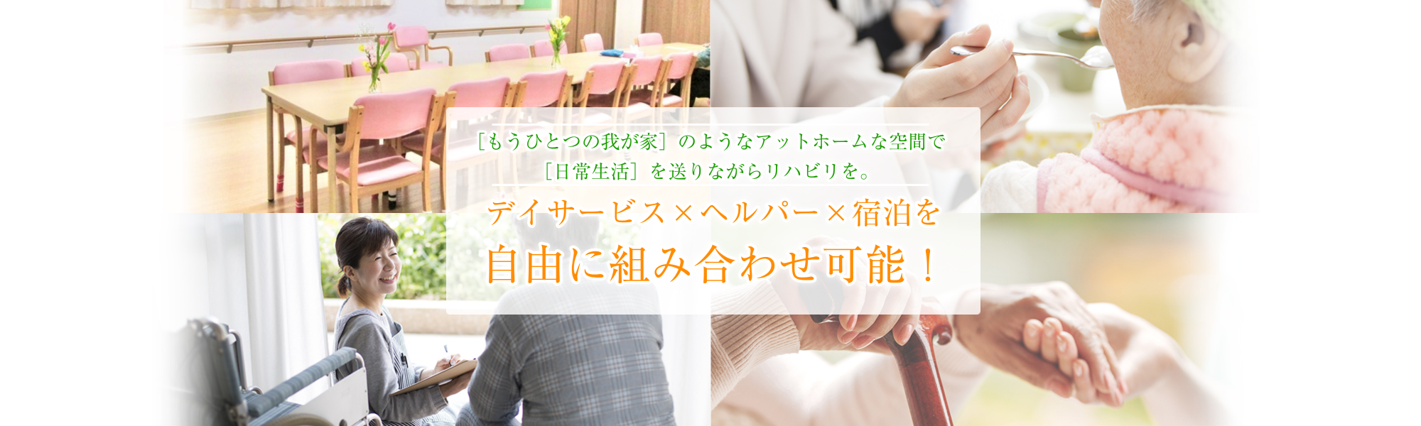 ご利用者様一人一人に合わせて【デイサービス・訪問ヘルパー・宿泊】の3種サービスを自由に組み合わせることも可能です。